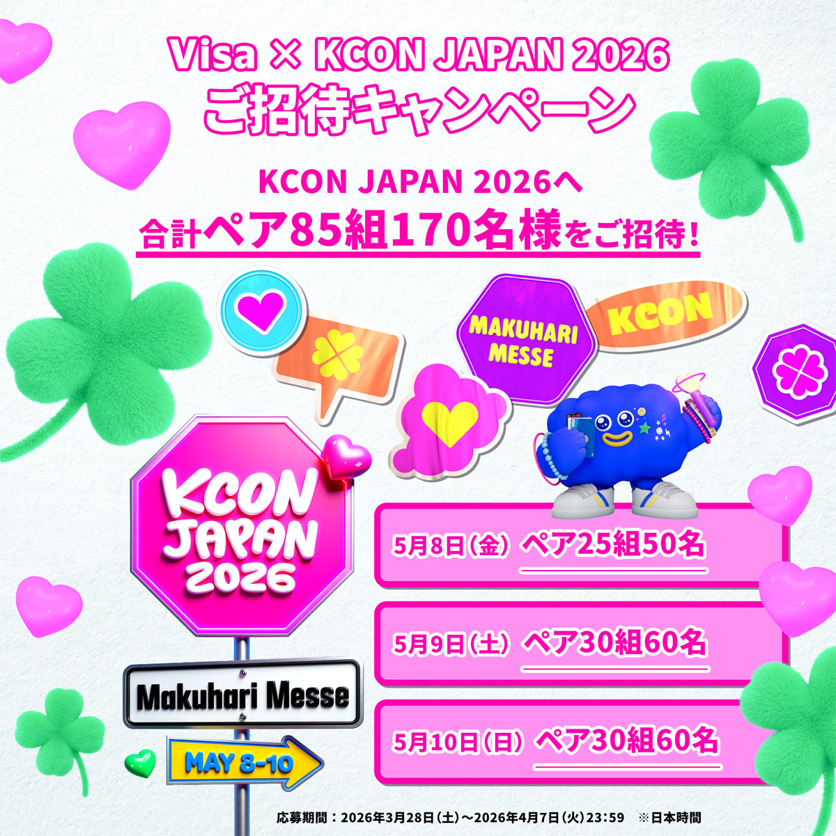 Visa公式Instagram(https://www.instagram.com/visajp_official/)をフォローのうえ、該当投稿へのコメントおよび「いいね」を行った方の中から、抽選で合計ペア85組170名様を「KCON JAPAN 2026」にご招待いたします。